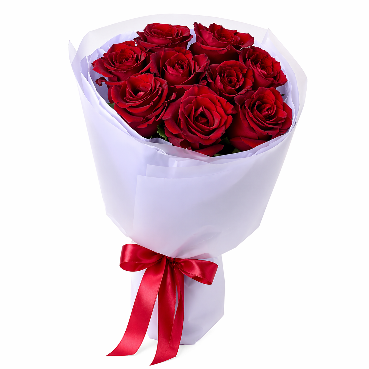Контрастная белая упаковка и красная атласная лента подчёркивают глубину цвета бутонов и создают элегантный, завершённый образ. В интернет-магазине доставки цветов FlowerCity вы можете купить букет из 9 красных роз с доставкой по Одессе в день заказа.