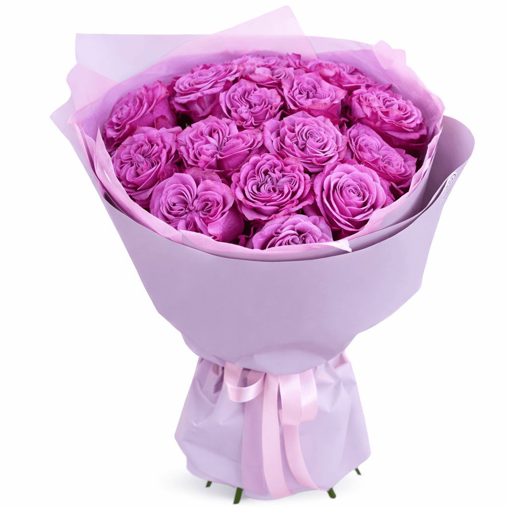 Эффектный букет из 15 эквадорских роз сорта Кантри Блюз — это сочетание благородной глубины оттенков и роскошного объёма. Бархатистые лепестки с переходом от нежно-лилового к насыщенному пурпурному создают по-настоящему загадочный и элегантный образ, который покоряет с первого взгляда.