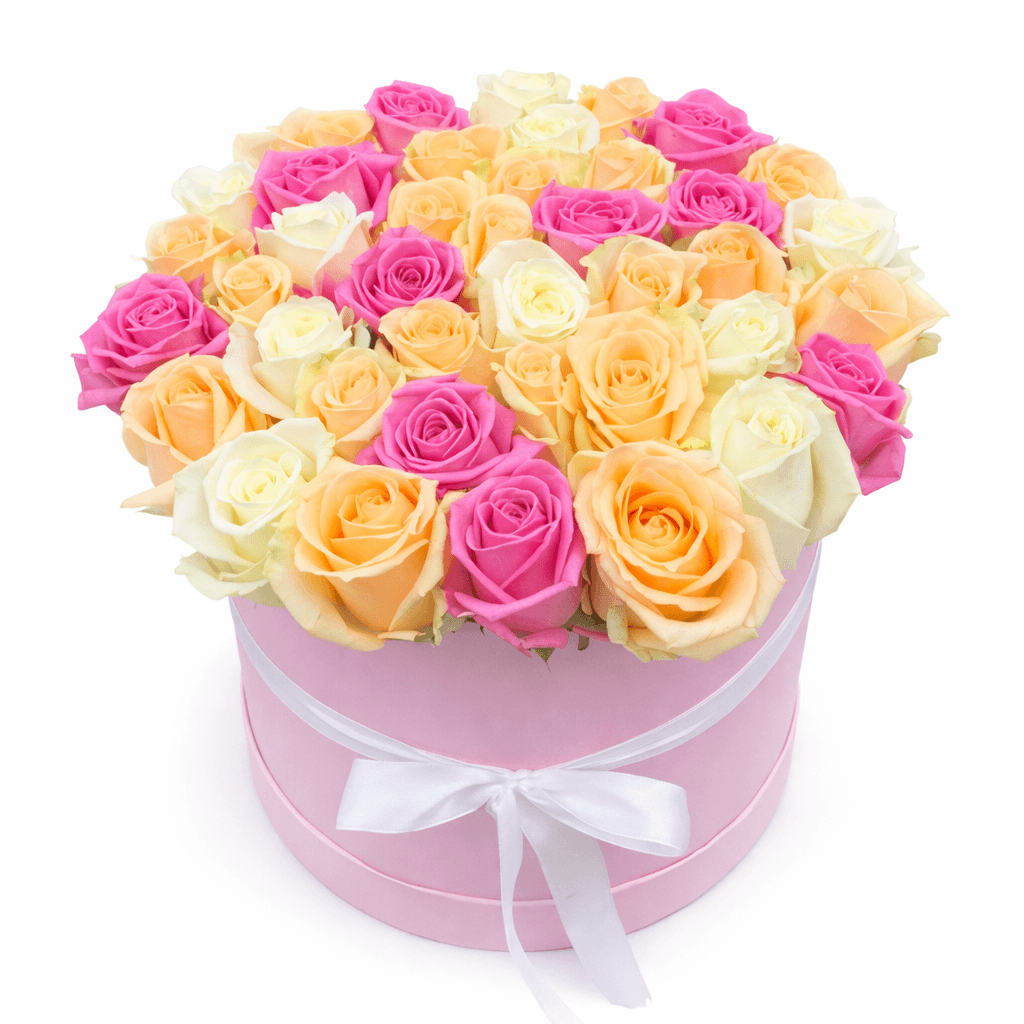 Главная Букеты Цветы и букеты в шляпной коробке Роза микс 31 шт в коробке