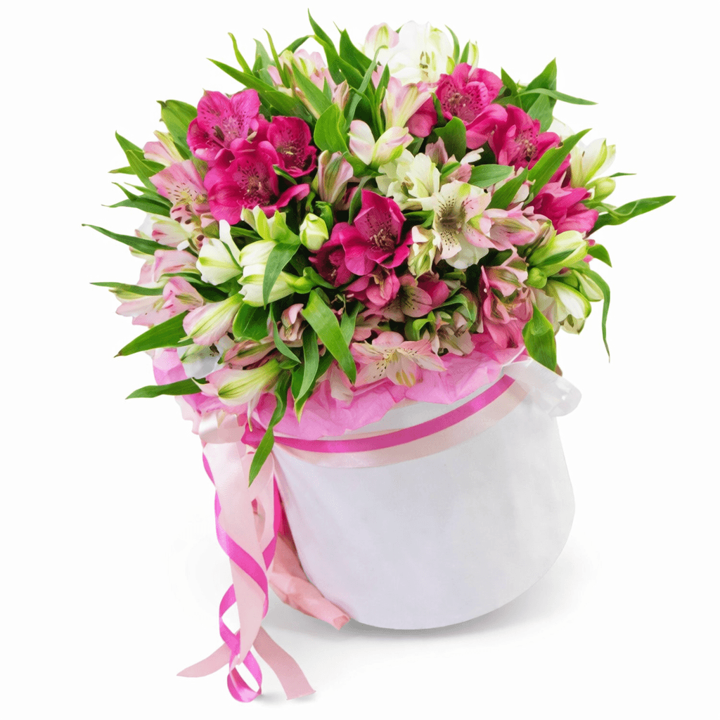 Ніжний мікс з альстромерій у білій капелюшної коробки.