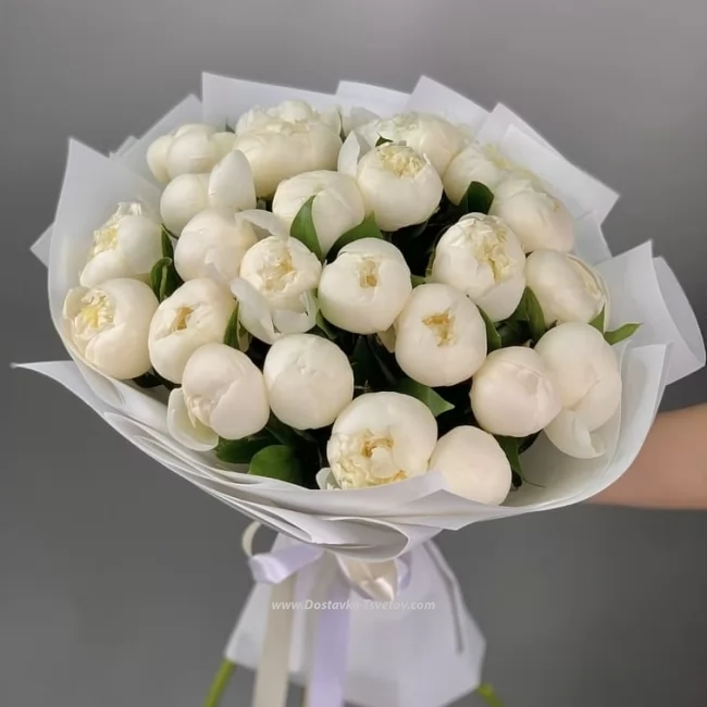 Этот букет — воплощение чистоты, нежности и минималистичной эстетики. Белые пионы с мягкими, многослойными лепестками выглядят по‑настоящему утончённо и создают ощущение лёгкости. Белая упаковка и аккуратная лента подчёркивают премиальность композиции, делая её универсальной и подходящей для самых важных моментов.