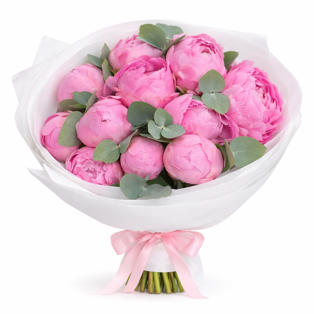 Букет півоній «Ніжна розкіш» — це елегантна композиція з ніжно-рожевих півоній, доповнена ароматним евкаліптом і оформлена у стильне декоративне пакування. Такий букет виглядає повітряно, витончено та по-справжньому розкішно завдяки великим пишним бутонам і м’якій пастельній гамі.
