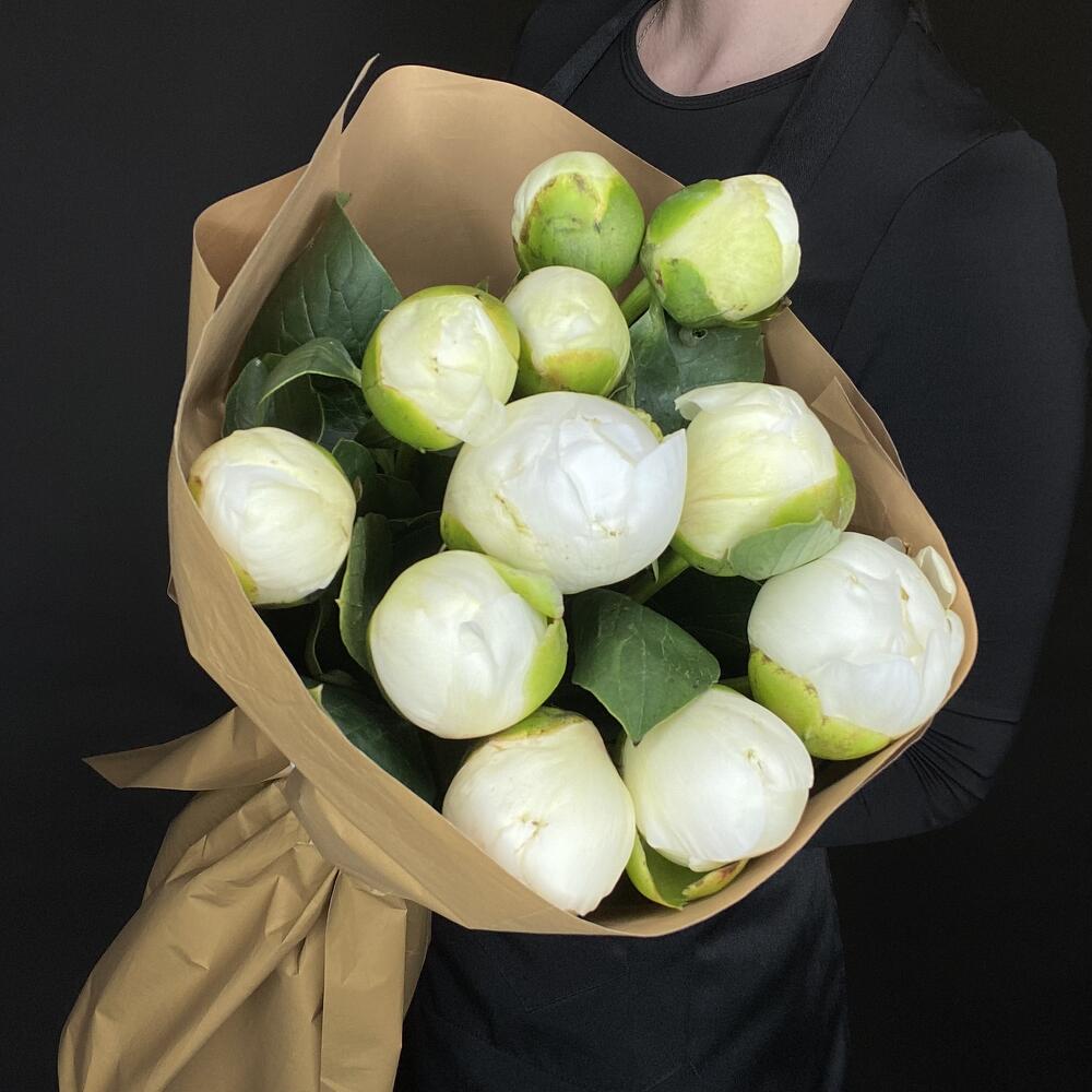 Свежий букет из плотных белых пионов‑бутонов, аккуратно собранных и оформленных в крафтовую бумагу. Контраст белых лепестков и тёмной зелени создаёт чистый, минималистичный и очень элегантный образ. Такой букет — идеальный выбор для тех, кто ценит сдержанную красоту и натуральность.