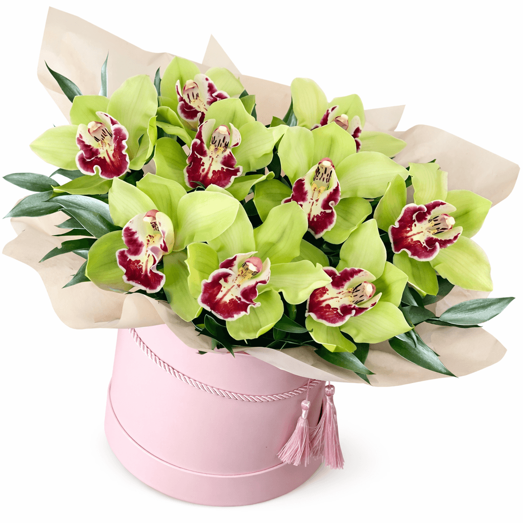 Привнесіть красу природи у свій будинок із цим вишуканим букетом із 9 зелених орхідей у стильній коробці. Орхідеї – символ вишуканості та елегантності, і цей букет підкреслить витончений смак та почуття стилю у будь-якому інтер’єрі.